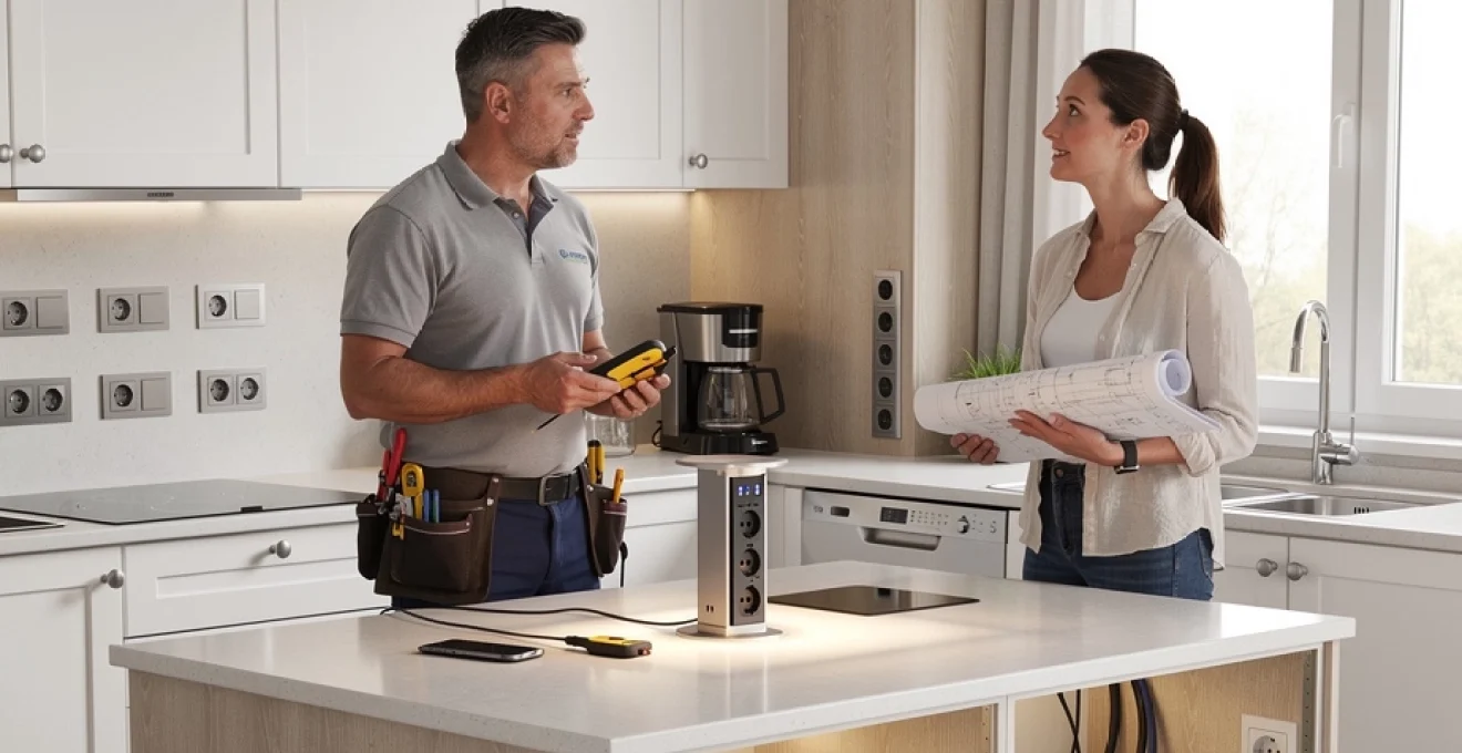 Ces blocs escamotables sont idéaux pour alimenter ponctuellement un robot pâtissier, un blender ou une bouilloire, puis disparaître une fois la préparation terminée. Ils existent en versions manuelles (à ressort ou à levier) ou motorisées pour les cuisines haut de gamme. Lors de l’installation, il convient toutefois de respecter les zones de sécurité autour des points d’eau et des plaques, et de s’assurer que le plan de travail possède l’épaisseur suffisante pour accueillir le boîtier d’encastrement.