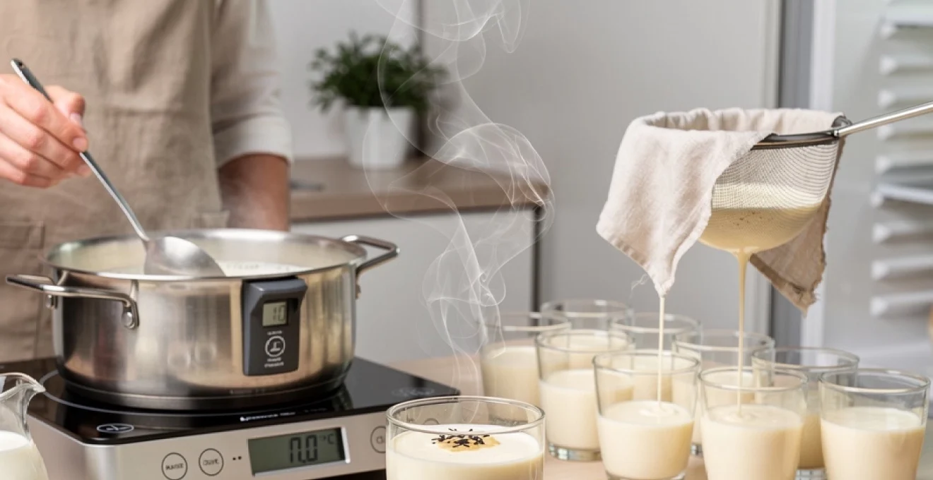 Filtrer la préparation avant de la verser dans les contenants permet d’éliminer tous les éléments susceptibles de perturber la texture : fibres de gousse de vanille, éventuels grumeaux de gélatine mal dissoute, micro-coagulations de crème. Un chinois étamine ou une passoire très fine est l’outil idéal pour cette opération. Placez-le directement au-dessus d’un pichet ou d’un bol muni d’un bec verseur, puis versez progressivement la crème chaude en la laissant s’écouler naturellement.