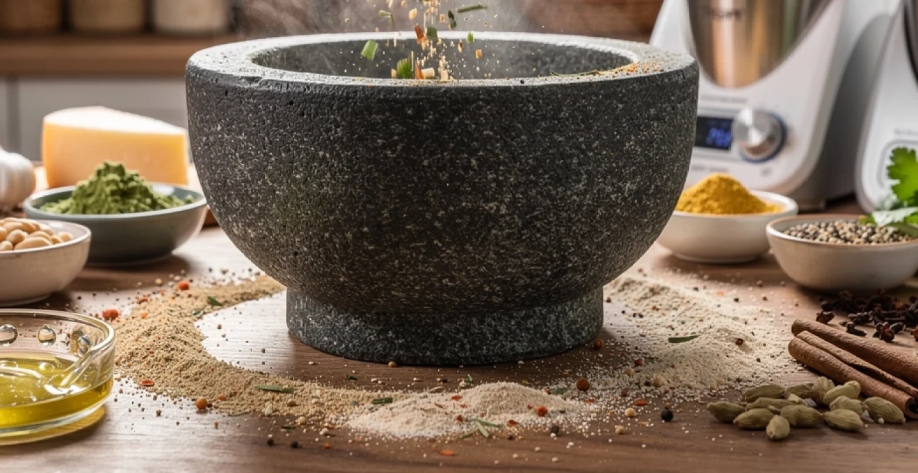 Parmi les différents matériaux disponibles, le mortier en granit s’impose comme la référence pour libérer les arômes avec précision. Sa masse importante, sa rugosité contrôlée et son inertie thermique en font un outil particulièrement performant face aux technologies électriques modernes. Alors que les Vitamix, Thermomix et autres robots multifonctions excellent pour les grandes quantités et les textures lisses, ils peinent à rivaliser avec la finesse aromatique obtenue par un mortier en granit sur de petites préparations intensément parfumées.