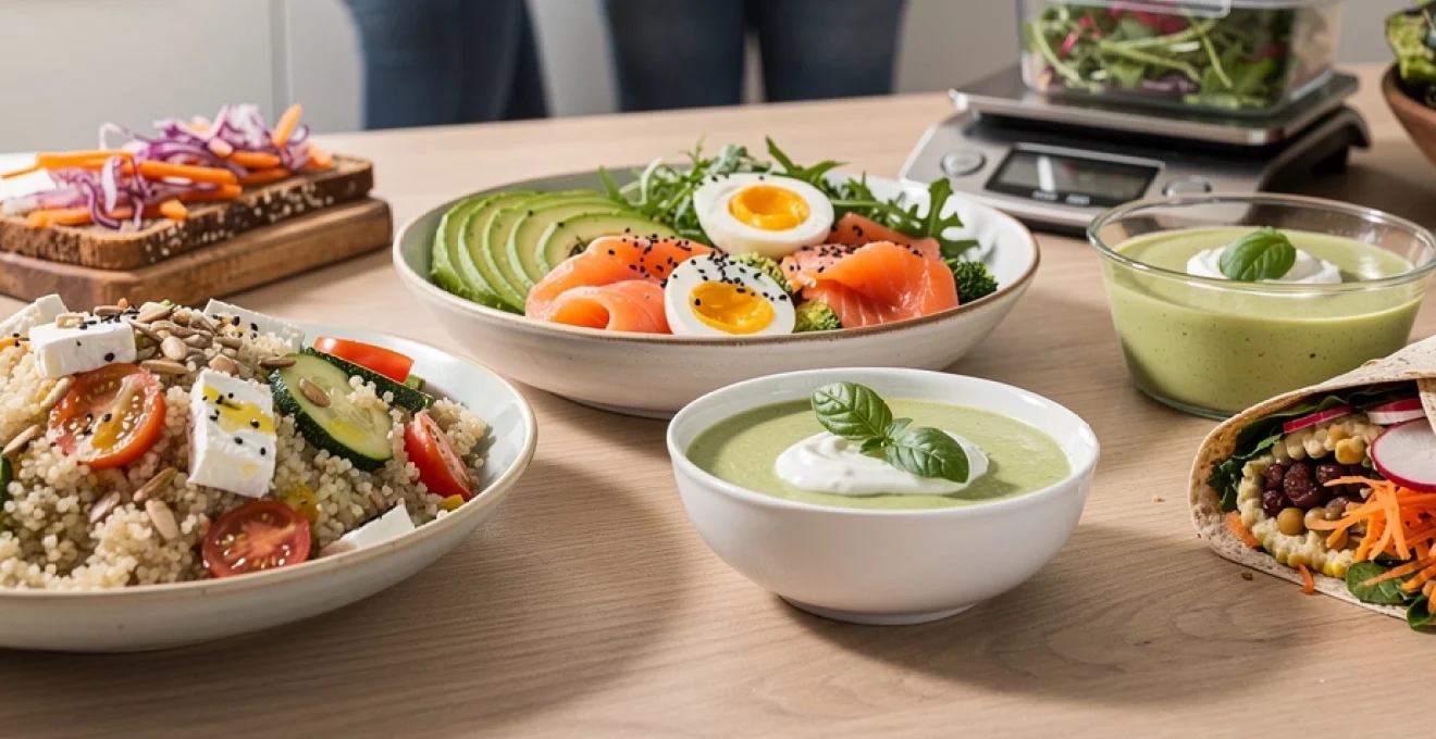 Concrètement, cela peut correspondre, par exemple, à 60 à 80 g de quinoa cuit, 100 g de légumes variés, 30 g de feta et une cuillère à soupe d’huile d’olive pour une salade de quinoa, ou encore à une tortilla complète, 40 g de houmous, 80 g de crudités et une petite poignée de noix pour un wrap. Sans devenir obsédé par les chiffres, avoir ces ordres de grandeur en tête vous aide à construire un déjeuner léger mais suffisamment nourrissant, évitant à la fois la sous-alimentation et les excès caloriques.
